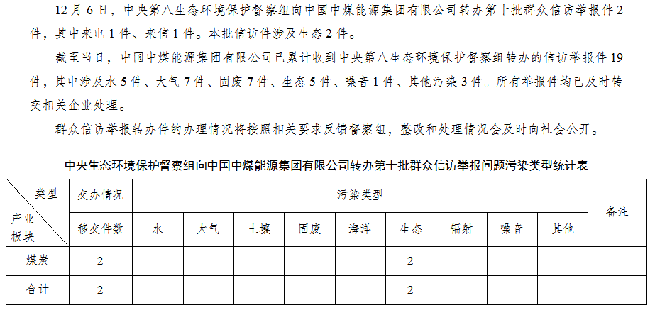 中央第八生態環境保護督察組向中國中煤能源集團有限公司轉辦第十批群眾信訪舉報件