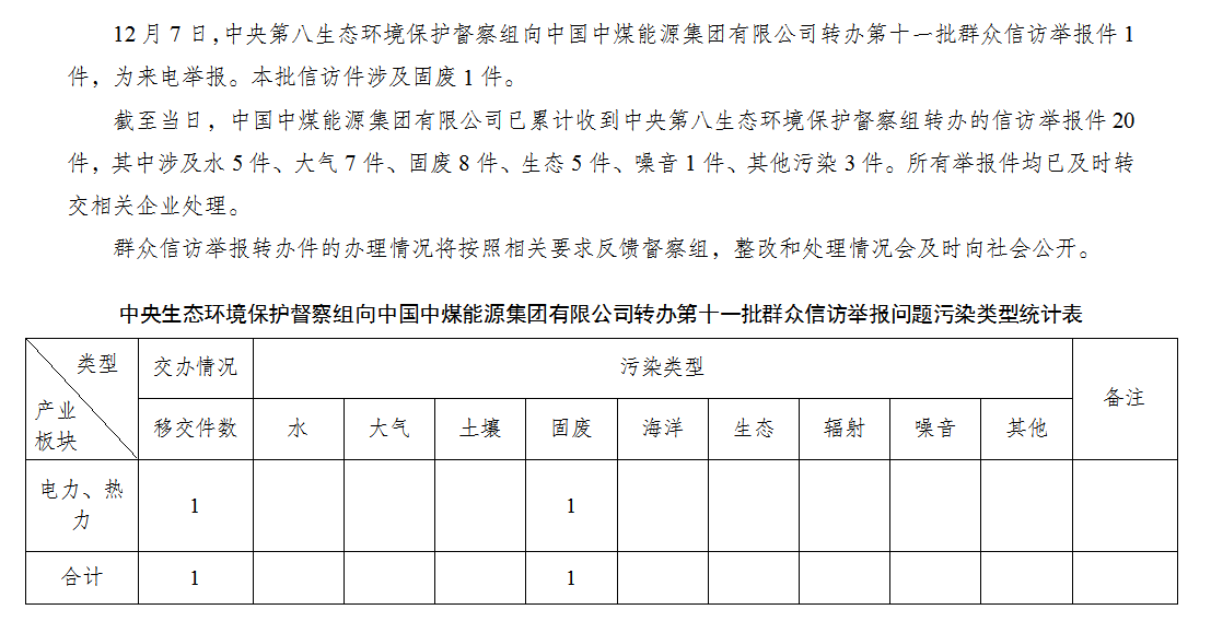 中央第八生態(tài)環(huán)境保護(hù)督察組向中國(guó)中煤能源集團(tuán)有限公司轉(zhuǎn)辦第十一批群眾信訪舉報(bào)件